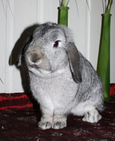 Snill, rolig og svært tillitsfull, ukastrert hannkanin med hengeører. Trolig av rasen dvergvedder eller en vedderblanding. Han har korthåret, grå pels med mørkegrå ører og lysere pels rundt øynene.