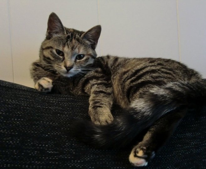 3-4 år gammel hunnkatt med spraglete pels og rosa nese. Hun er chippet og bærer et sort halsbånd med bjelle og navnetube. Hun er ikke spesielt glad i folk og noe redd for lyder og brå bevegelser.
