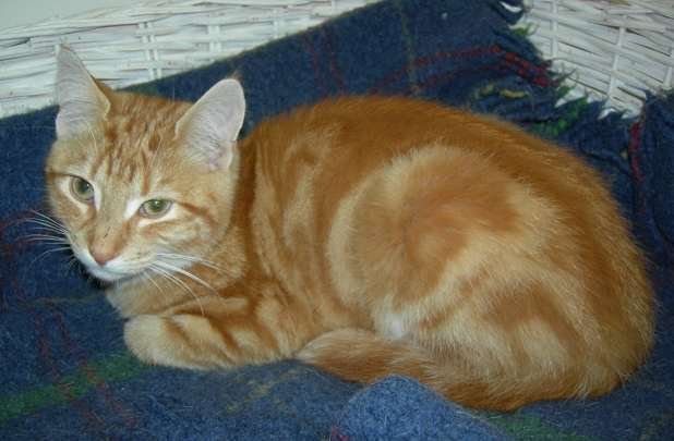 Trøndergutten er en oransjetabby gutt med sirkelformet mønster i pelsen sin. Hvit hake/munn.