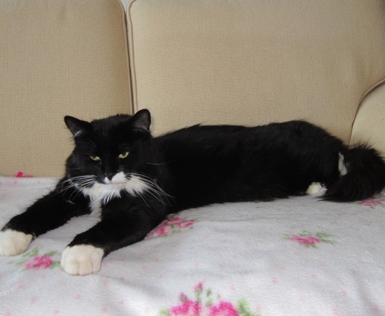 Svart langhåret skogskatt (kraftig hale), hvit under brystet og ved underkjeven. Hvite forlabber og hvite bakbein.
