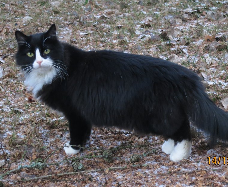 Denne katten har oppholdt seg hos meg siden Mandag 9.desember 2014 ca 23:30 på Lierskogen. Den virket veldig sulten, kald og veldig selskapssyk. Den er også tynn/slank. Virker ellers i god stand.