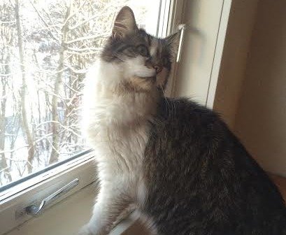 Katten har gått i området i flere dager. Vi har tatt henne inn og gitt henne mat og drikke.