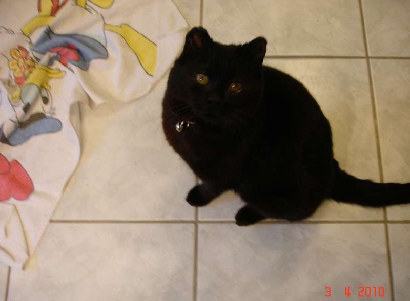 Svart og ikke fullvoksen. Ørene hans er deformerte pga. forfrysninger han fikk i vinter. Begge mangler "tupper" og derfor ser ansiktet hans litt "firkantet" ut.