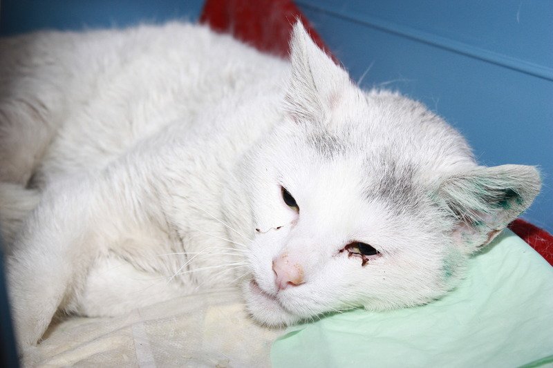 Katten er gråhvit og nok hatt et hjem. Den er nå redd, men tydelig vant med mennesker.