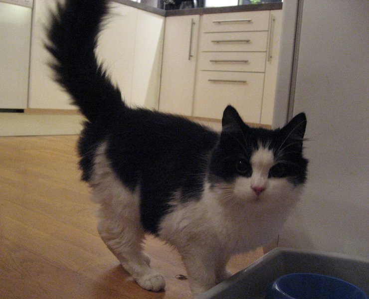 Pusen gikk rett inn verandadøra og til matfatet. Hun er tynn og utsultet og har nok gått seg bort fra hjemmet sitt.