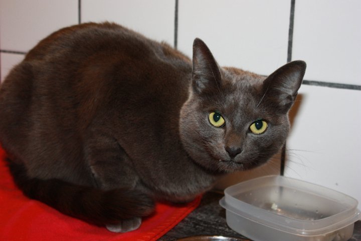 Katten er helt grå. Det er en ung jente, men usikker på alder. Vi har ikke sjekket om hun er sterilisert. Ikke merket. Sosial og glad i barn.