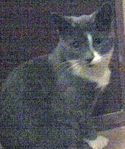 Grå med hvitt bryst og hake. hvit stripe på venstre side av munn og nese. hvite labber. Glad i folk. Tålmodig med unger. Har blitt hentet ned fra trær to ganger før.