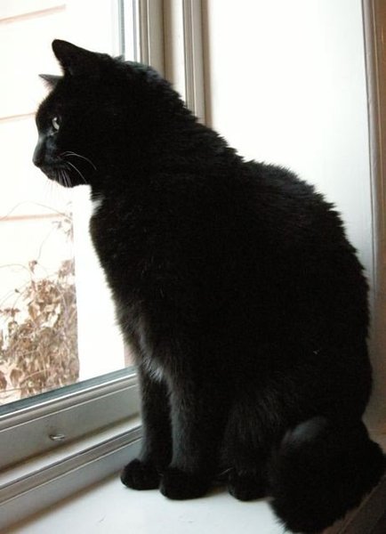 Eugene har korthårert sort pels med hvit flekk på halsen og magen og er kastrert.