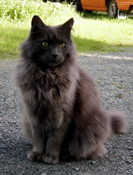 Helgrå langhåret kastrert hannkatt med totalt uleselig talltatovering i venstre øre. Meget snill og tillitsfull. Har et tydelig hakk i venstre øreflipp.