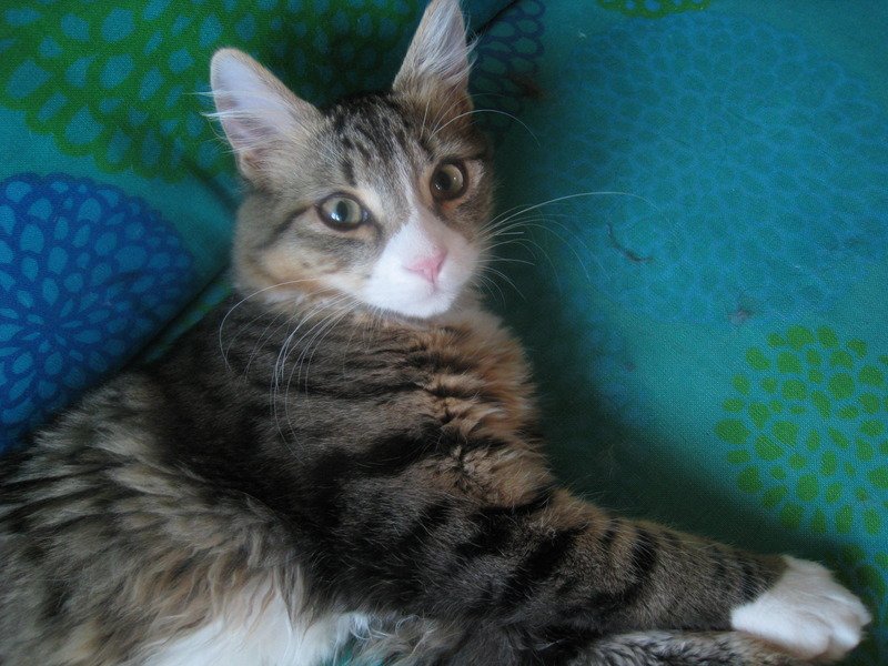 Beige med noen svarte striper. Hvit under magen, halsen og snute. Hvite poter. Glad, vennligsinnet katt.