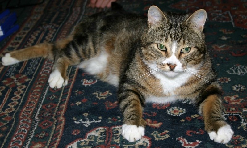 Ganske stor, korthåret tabby/gråstripete kastrert hankatt med hvite poter, snute (bittelitt skjev tegning), bryst og mage. Snill, men pleier å være veldig sky ovenfor ukjente mennesker.
