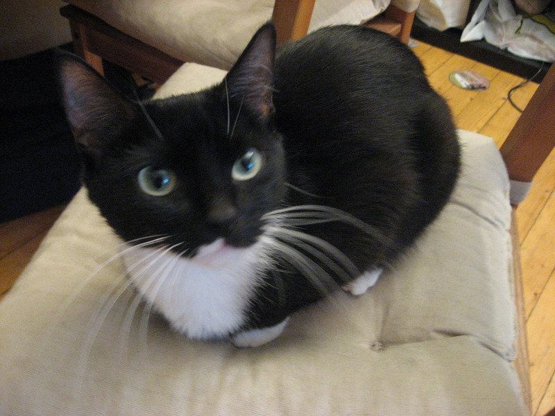 Hun er mest sort, men har en liten hvit stripe på oversiden av "leppen" på høyre side i ansiktet. Hvit på halsen/under haken, magen og hvite sokker på alle labbene. Har hvit "bart", både over øyne og munn.. Lyder navnet sitt Lillepus. Er glad i barn og kan lett slå følge.