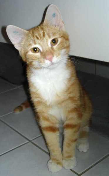 Slank katt, lang hale. Spesielt sirkelformet mønster i pelsen. Gult reflekshalsbånd. Er redd folk - kan gjemme seg i garasjen eller boden din.