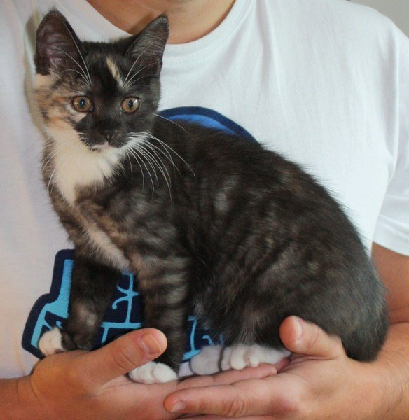 Pus er svart og grå tigerstripet-aktig, med hvitt bryst og hvite og brune flekker på høyre side av hode.