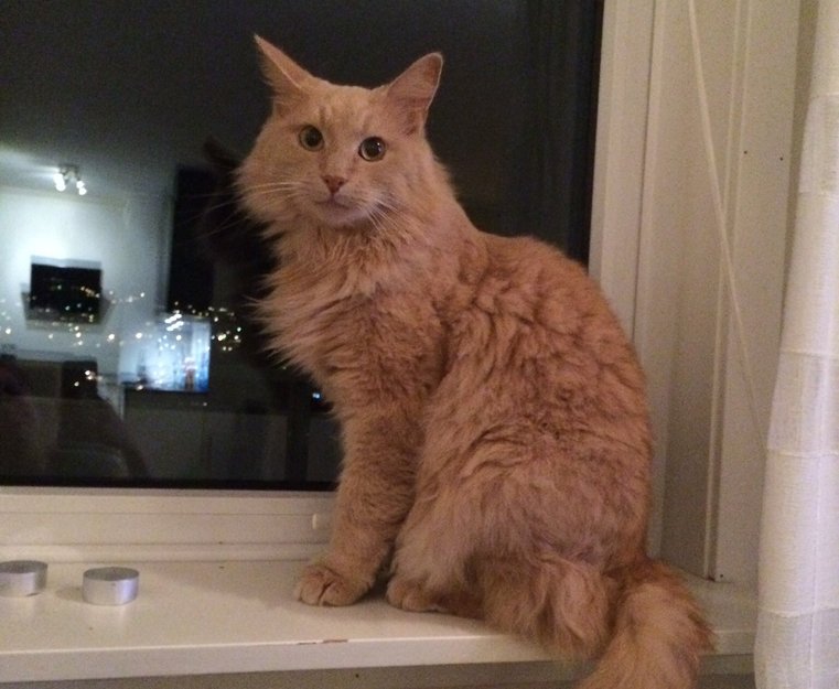 Rød/oransje farget katt som er veldig glad i mennesker. Lang hale med hvit tupp. Han har et brunt halsbånd med en refleks-fisk på.