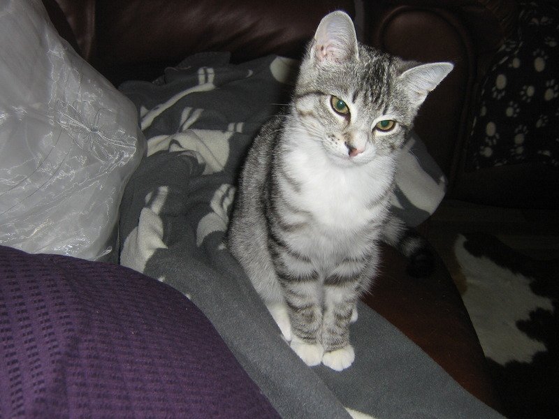 En kosete og barnekjær katt. Litt sky utendørs. Har hvitt bryst og hvite sokker. Det ene bakbenet er hvitt langt oppover låret. 8,5 mnd.