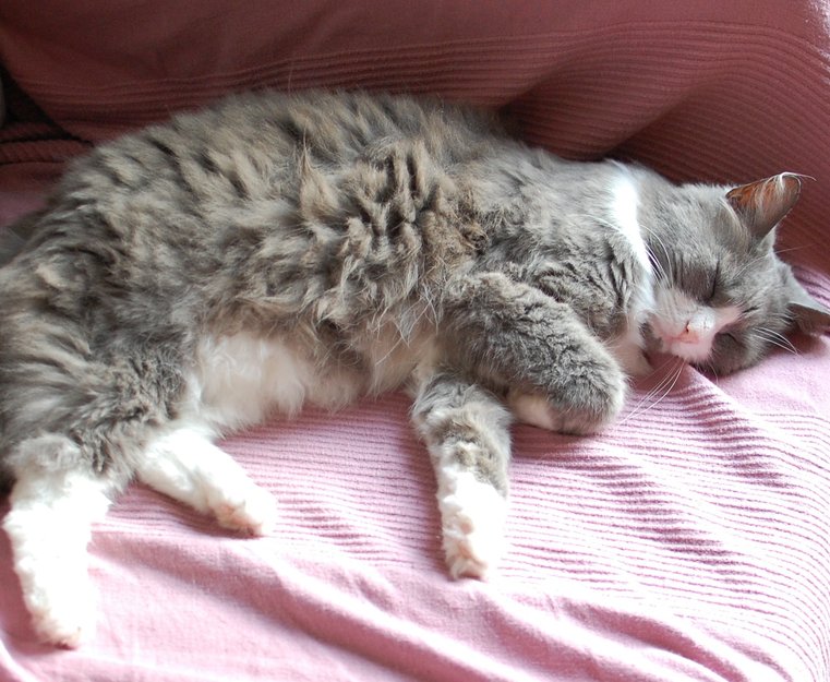 Stor hunnkatt, hun er grå med hvitt bryst, hvite sokker og hvit snute. Under haka har hun en grå flekk. Labbene er buskete og hun har "løvemanke". Har på seg halsbånd, er øremerket og veier 5 kg.