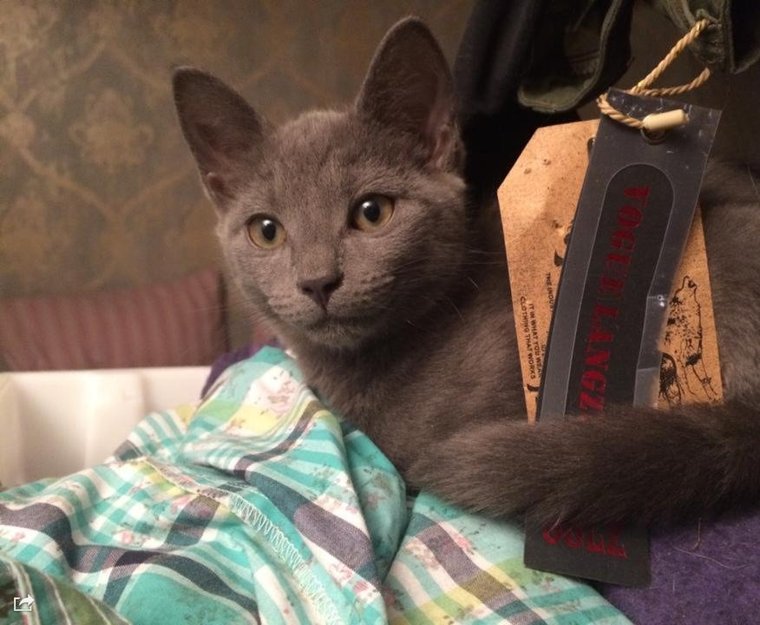 Helt grå overalt med svake tigerstriper i pelsen. Korthåret og litt nervøs.