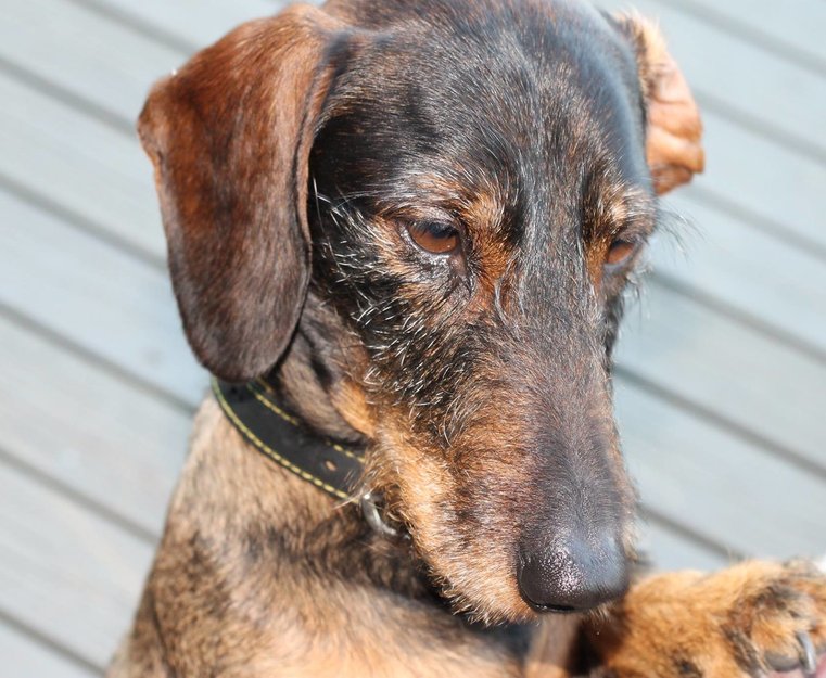Dachs strihåret pels, brun/svart. Har på seg halsbånd som bildet (svart farge)