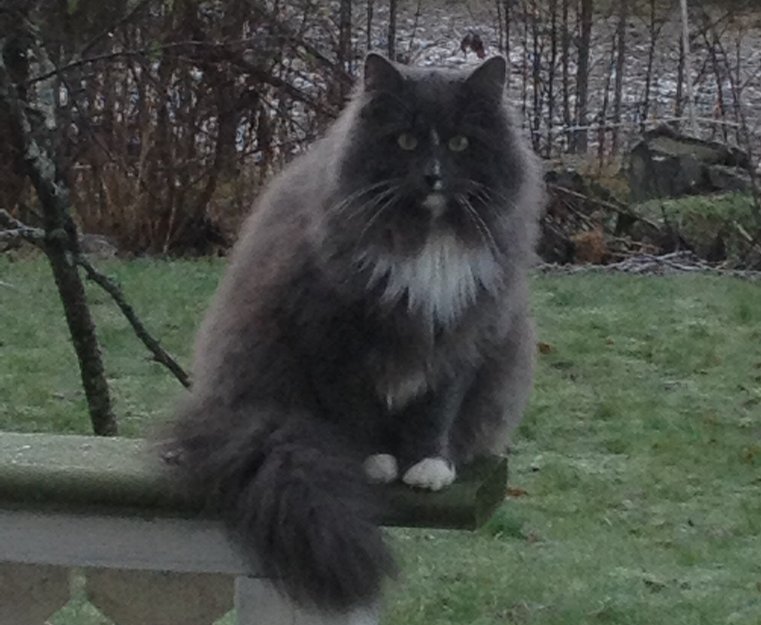 Ludo er langhåret, rent grå med hvite poter og litt hvitt i ansiktet.
