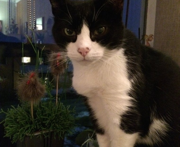 Kom hjem i natt etter nesten to uker borte. Han har nok vært på festival uten lommepenger. Sliten, tynn og skrubbsulten og tørst, men blank pels og god form. Ingen skader. Sannsynligvis vært innestengt i garasje/bod under musejakt.