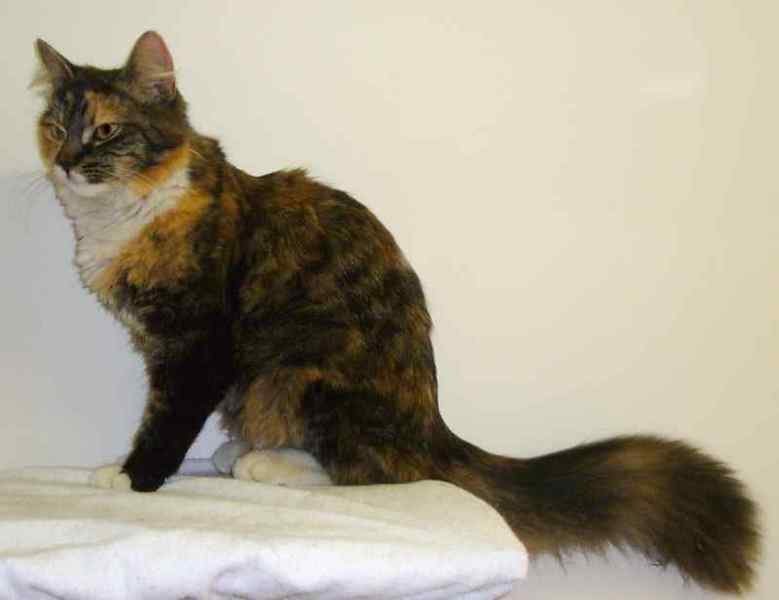 Vakker flerfarget katt med spesielt utseende. Snill og kosen katt.