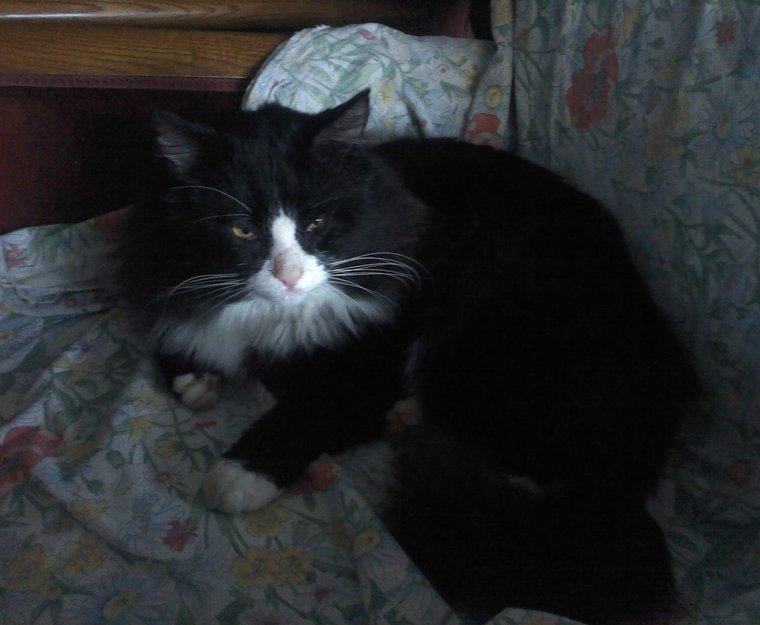 Langåret huskatt. Sort pels og hvitt ansikt og hals og hvitt på potene.