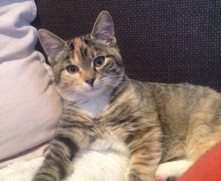 Liten med hvite poter, har en orjanse flekk i pannen og sort nese. Virker tillitsfull med mennesker.