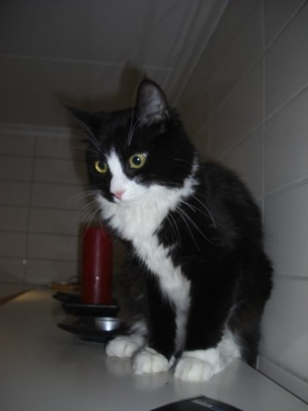 Svart katt med hvit stripe på nesen, hvit under magen og på halsen. Hvite labber og en hvit flekk bak på høyre bakfot. Rosa nese med svart flekk og rosa poter
