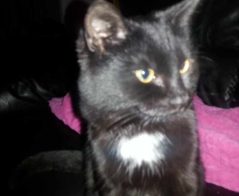 Lang sort pels med en hvit flekk på brystet. Har muligens på seg en rød sele med mindre hun har mistet den på ferden eller noen har tatt den av.