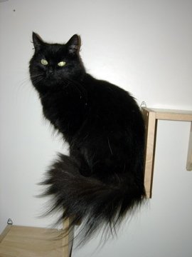 Brun/sort langhåret hunnkatt med stor buskete hale