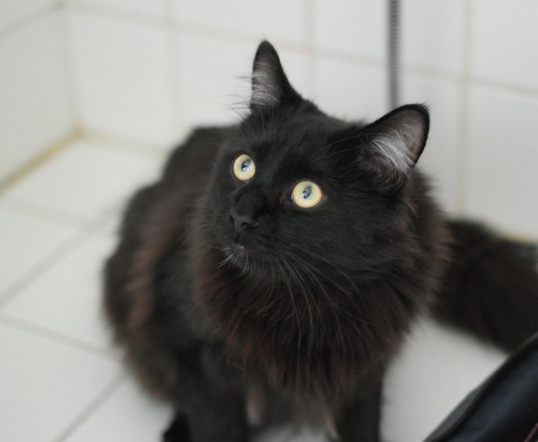 På halsen og og et par steder på magen har han noen korthårede flekker etter barbering (2 måneder siden). Runde gul/grønne øyne.