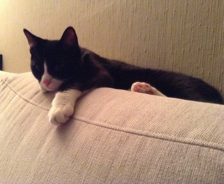 Ukastrert hannkatt, tipper i underkant av et år. Ikke id-merket. Svart og hvit korthåret. Hvite poter og hvit stripe på nesen. Gule øyne. Blank og fin i pelsen, tillitsfull og kosete.