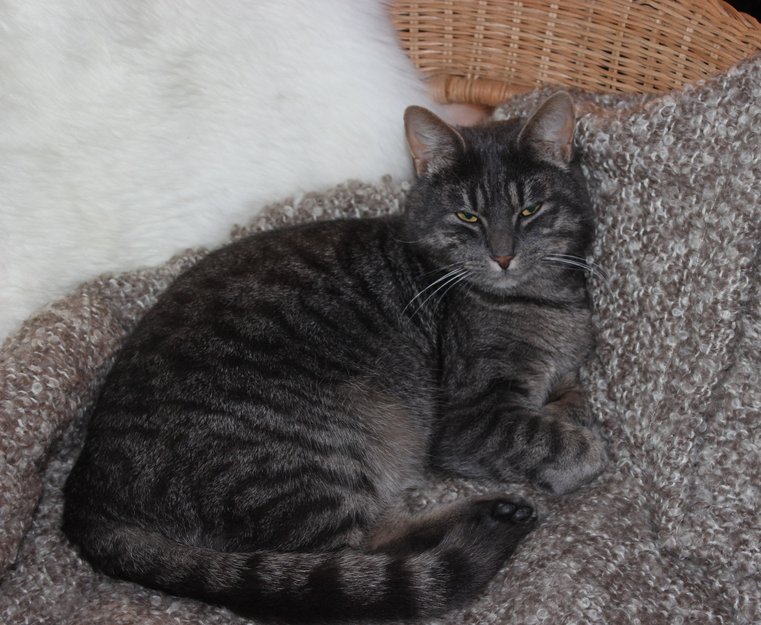 Hun heter Molly, og er en grå stripete hunnkatt. Hun er ganske stor, med veldig myk pels.