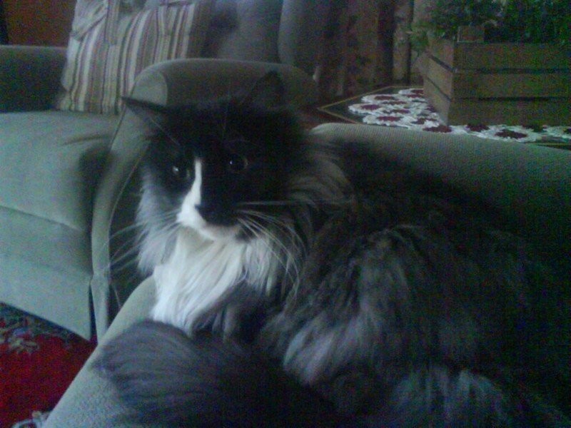 Grå main coon katt, ca. 5 kg. Kjennemerket: Spesiell i ansiktet, med halve ansiktet hvitt og det andre halve grått. Flott hale. "Prater" litt, ikke veldig kosen og noe skeptisk til fremmede.