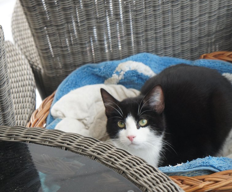 Slank katt. Svart og hvit. Hvit ytterst på halen. Hvite høye sokker på labbene. Venstre bakbein har liten svart flekk. Høre bakbein har større svart "belte". I venstre øre står det "ID ID"