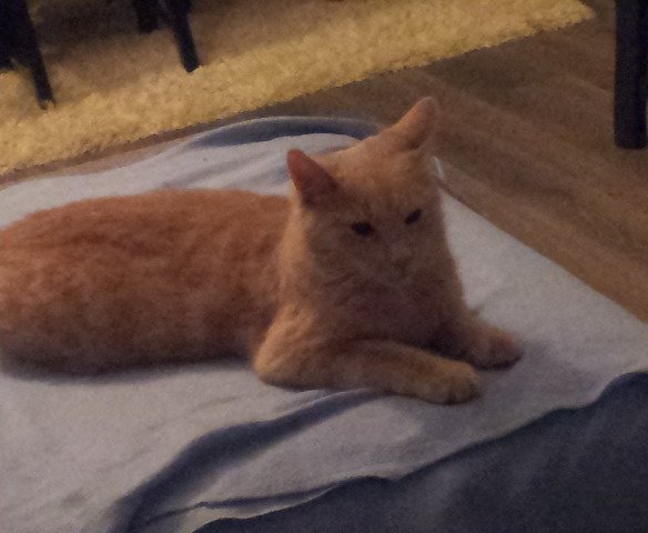 Oransje/kremaktig farge. Leken og glad. Liker kos og å ha det varmt.