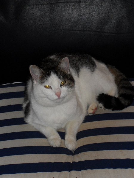 3-årig hunn katt, grå-hvid med gule øjne og rosa nase. Mitzi er en lille og forsigtig katt.Meget kælen.