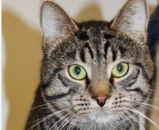 Tigerstripet over hele, hvit rett under kjeven og grønne øyne. Ca 5 kg