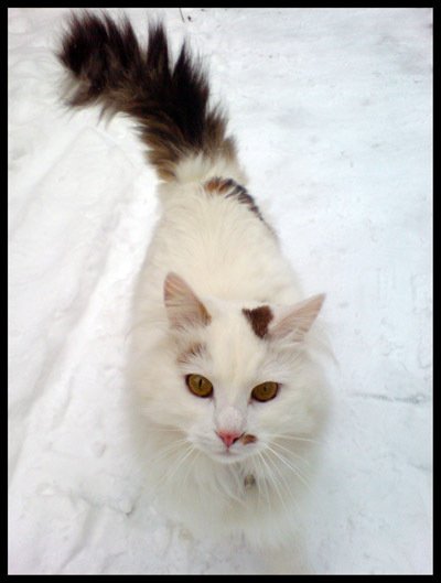 Davis er en stor huskatt, med lang hvit pels, og buskete svart/brun hale.