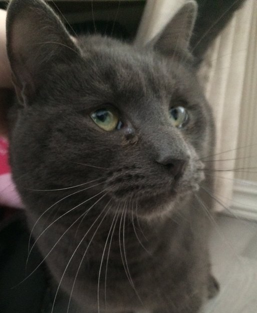 Katten er grå og korthåret. Virker vant til folk å er veldig kosete. Har et sår på foten som verker litt.