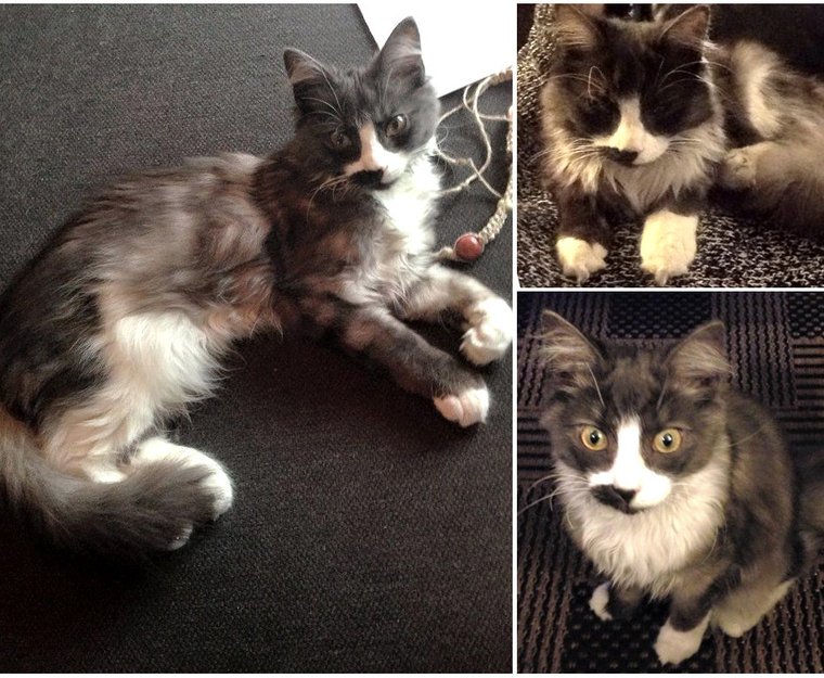 Lukas er 8 måneder gammel, chippet, øremerket og kastrert. Han er grå med hvit underpels, hvite labber og et hvitt merke med en mørk flekk i ansiktet. Han er snill og leken men sky for fremmede.