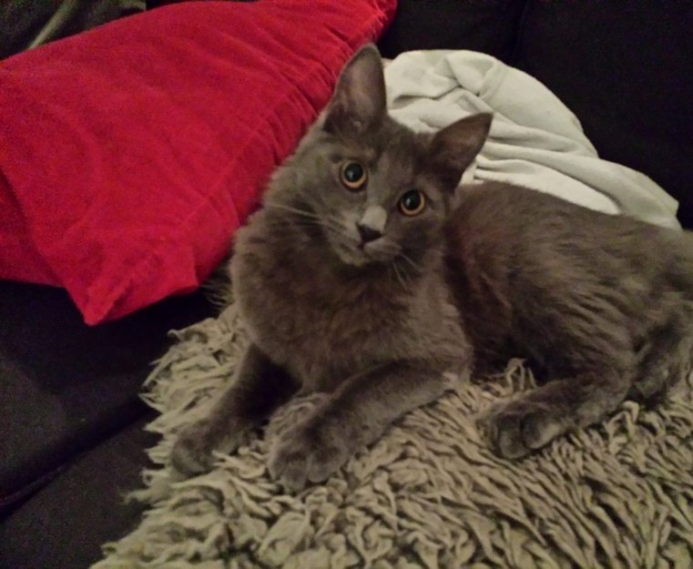 Kosete og liker å sitte på fanget, men kan være engstelig rundt masse folk eller mye lyd. Mangler halsbånd.