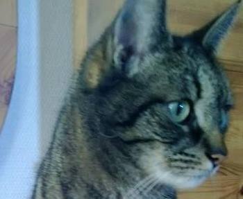 Mira er en sort gråbrun tigerstripet (noen hvitt under haka) hunnkatt på 5 år. Hun er sterilisert , chippet og har en tydelig M tatovert i begge ører. Hun er litt sky for fremmede.