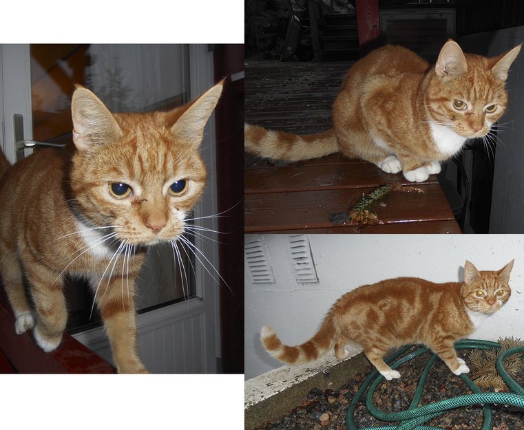Katten kom natt til 12.02 og banket på døra (bokstavlig talt) og var veldig sulten og intens. Ga den litt mat og tok bilder. Kom tilbake i går kveld og nå i ettermiddag, fikk tatt bedre bilder. Den har hvit krage og poter, litt redd, virker som under året gammel.