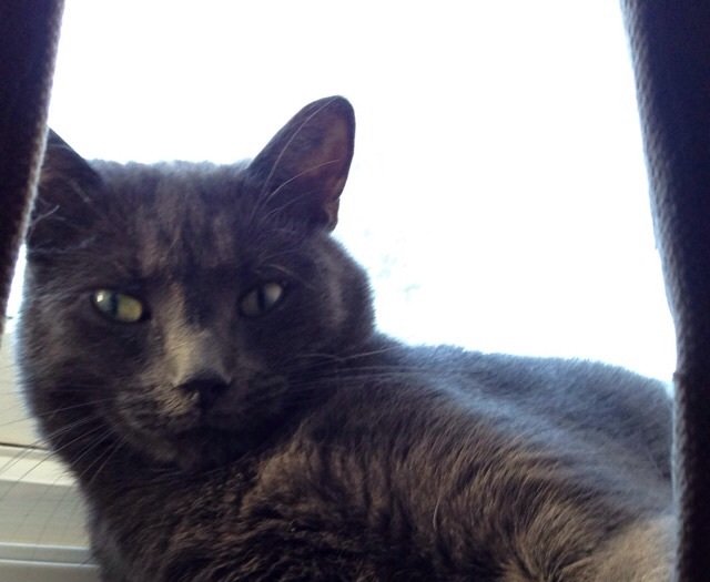 Han er en stor katt! Gråsvart kort håra katt.. Litt hvit under haka..