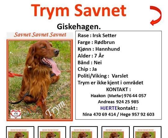 Trym løp ut etter rådyr 16. februar 2015 kl. 0750. Han har desverre ikke halsbånd på. Han er blitt observert på Holmendammen, Midtstuen (rundt 1800, 16. februar) og I Nordmarka mellom Frognerseteren og Skjennungstua (rundt kl. 2100, 16. februar).