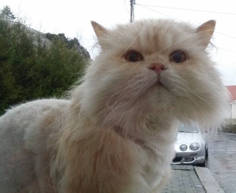 Denne katten kom til oss tirsdags kvelden. Vi hørte masse mjauing utenfor og lurte på hva det var. Der satt det en hvit, langhåret hannkatt. Vi la merke til at halve pelsen var barbert vekk og at den var kald. Vi ga den litt mat og den var veldig sulten.