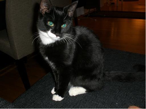 Sort liten hunnkatt, kastrert med chip. Halve munnen er hvit, værhårene er hvite, potene er hvite halsen og magen er hvit. Egentlig ganske sky. dypt savnet av familie på sola.