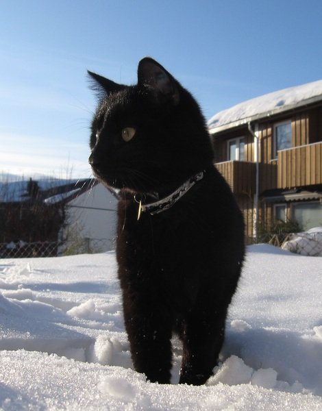 Helt sort, litt tynnere i pelsen der halsbåndet har sittet, ganske liten, korthåret men har buskete hale som han har rett opp. Hadde på seg reflekshalsbånd med sort bunn og sorte mus på, og gullfarget rund plate med telefonnummer. Har tatovert bokstavene ID i venstre øre. Svartepus mjauer en del, men lager mest purrelyder, høres ut som "Prrrrmao".